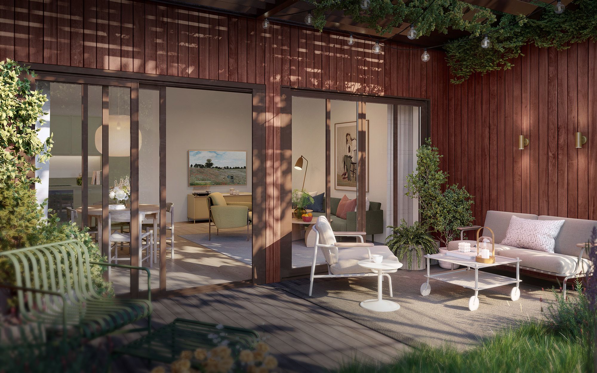 Leilighetene i første etasje har egen inngang fra bakkeplan og store markterrasser mot sørvest, mens de øvrige får gjennomgående lys og terrasser mot vest – mange også med ekstra balkong mot øst. Pergolaer, karnapper og sprang i fasaden skaper lune uterom og privatliv for hver beboer.